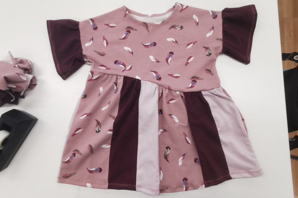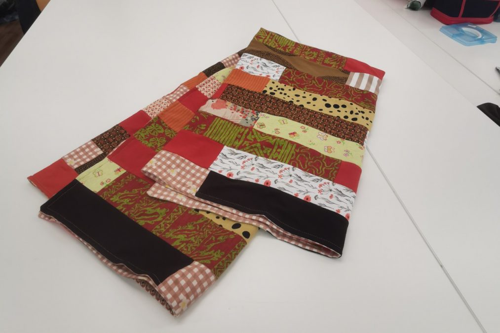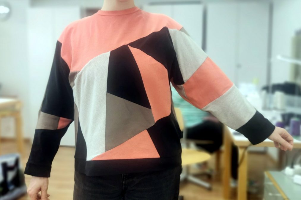 Leikkaa tilkut kuitenkin ensin suorareunaisiksi. Voit kokeilla rohkeasti yhdistellä tilkkuja pinnaksi ja leikata syntyneestä kankaasta vaatteen tai suunnitella tarkemmin tilkkujen rytmin ja sijainnin. Tilkut kannattaa ommella toisiinsa joko saumurilla tai ompelukoneen joustavalla ompeleella. Muista kuitenkin tarkistaa ja kokeilla ompeleen säädöt ja vaihtaa saumuriin tai ompelukoneeseen trikoolle sopiva pallokärki-, stretch- tai hax-neula.