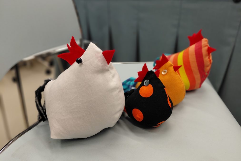 Lopuksi kanat täytettiin, ja erilaisilla napeilla tai helmillä sai halutessaan viimeistellä kanalle silmät.