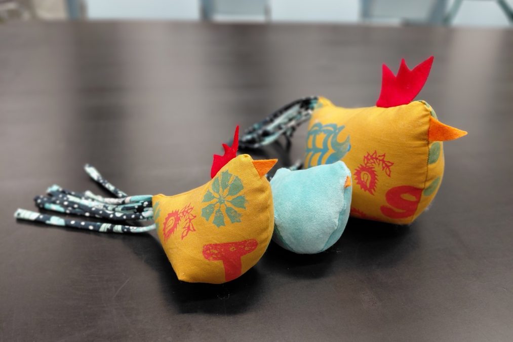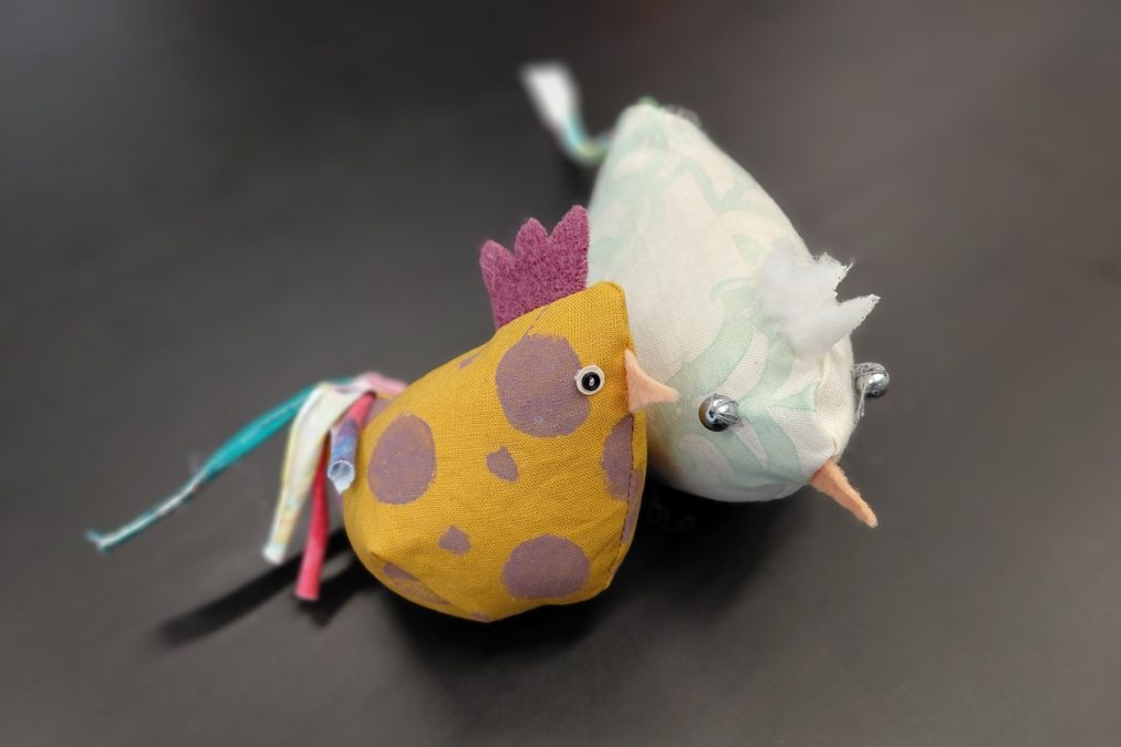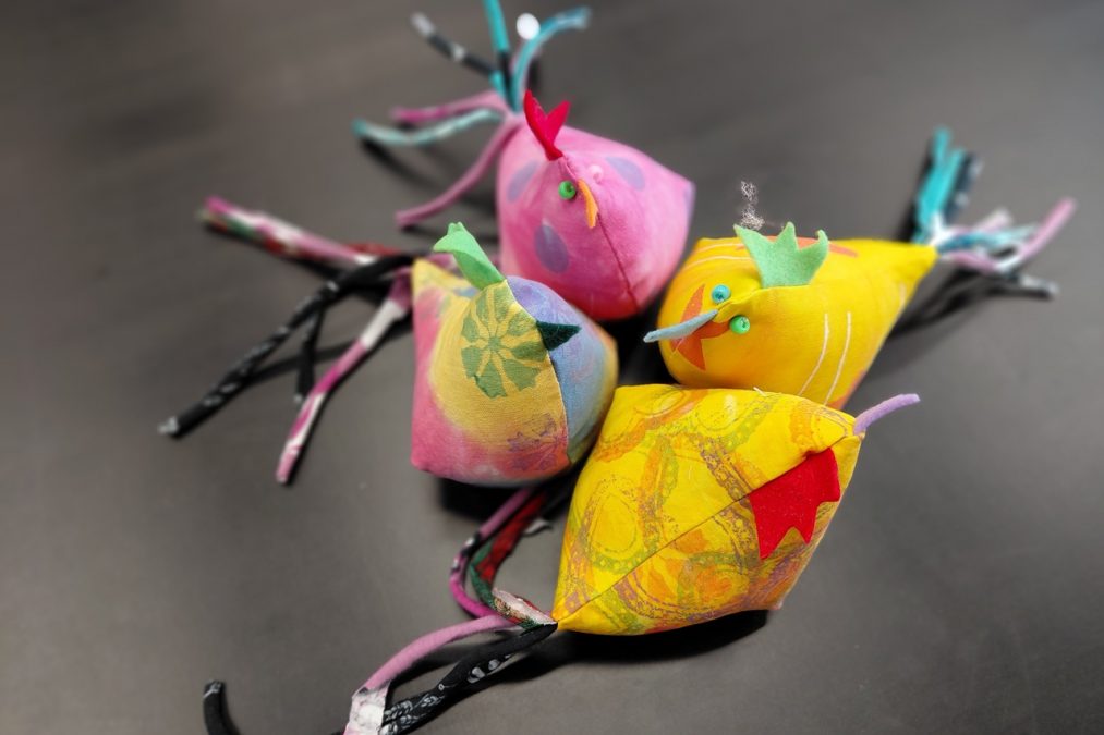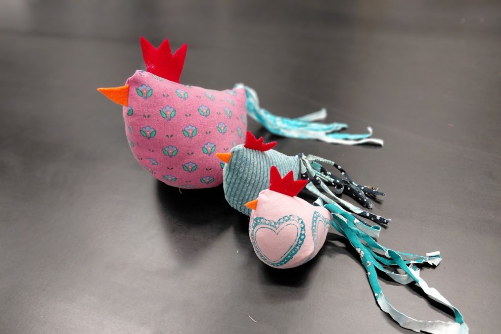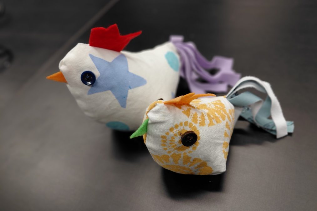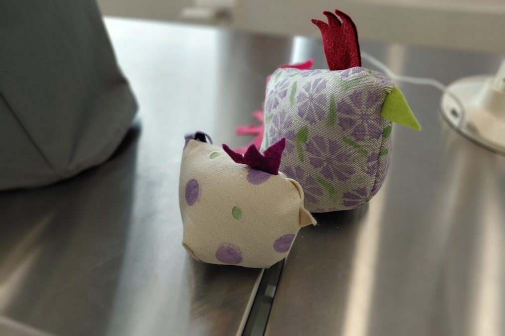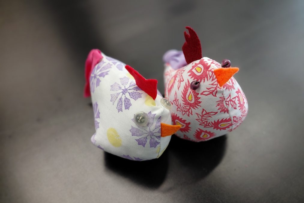 Pääsiäisen tuloon on mukavaa valmistautua vaikkapa ompelemalla pääsiäiskanoja! Pääsiäiskanoja lapsen kanssa -kursseilla painettiin kangasta erilaisilla leimasimilla, joka innosti monia kurssilaisia – aikuisia sekä lapsia. Painannan jälkeen kankaasta leikattiin kaavan mukaiset kappaleet isoon, pieneen ja/tai keskikokoiseen kanaan. Erivärisistä huovista leikattiin kanoille heltat ja nokat, ja trikootilkut suikaloitiin pyrstöiksi.