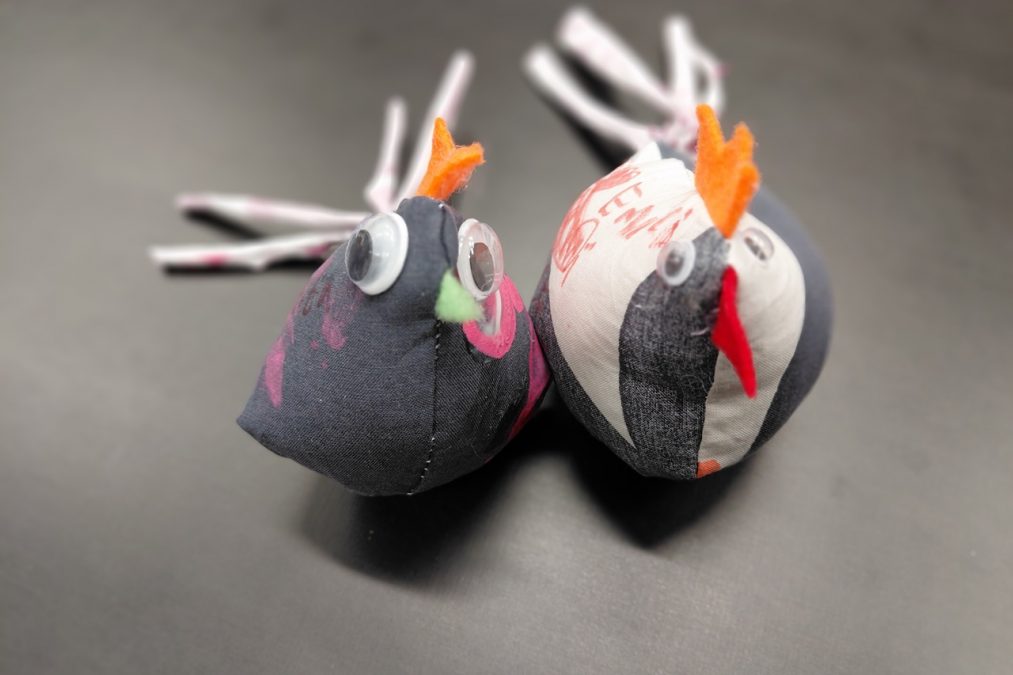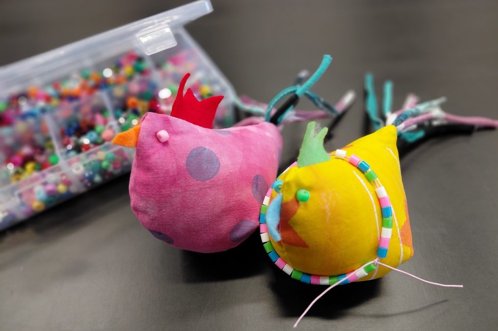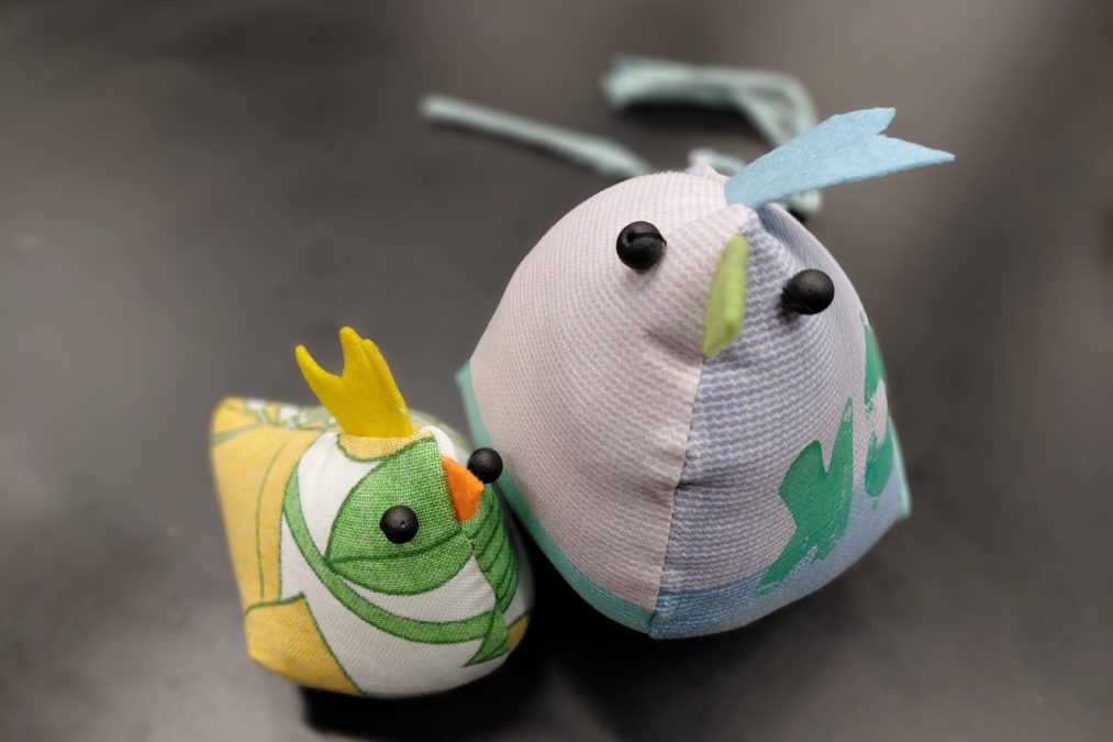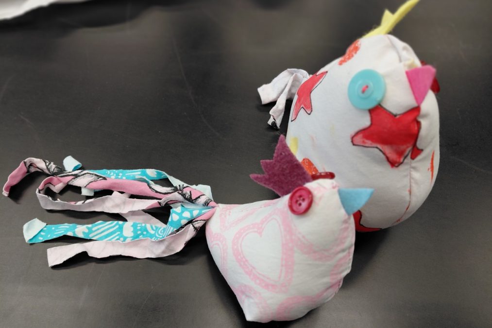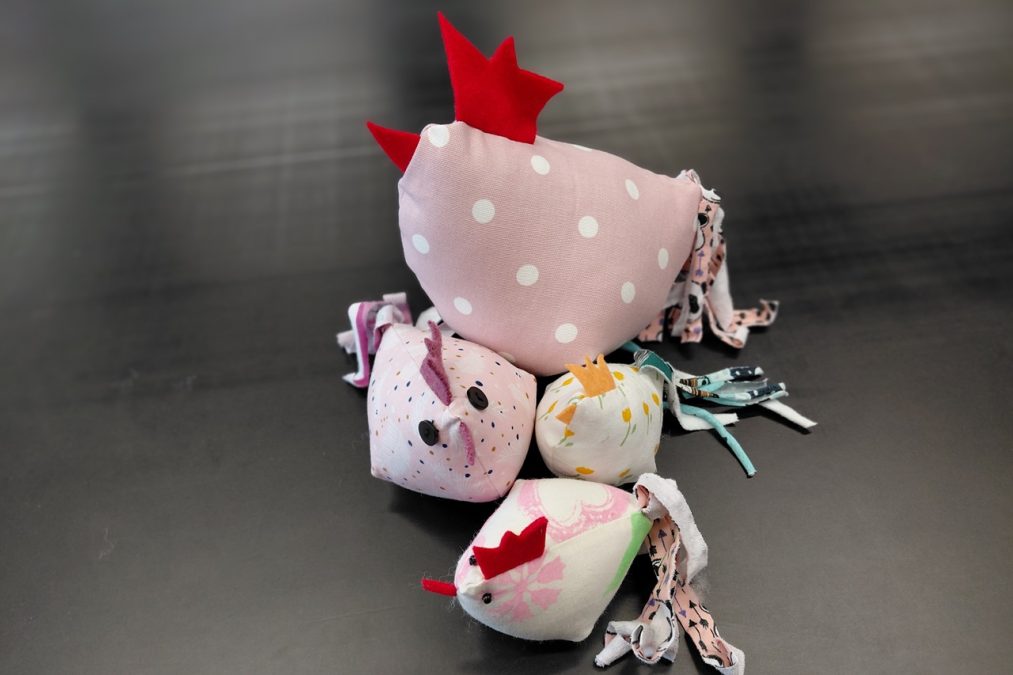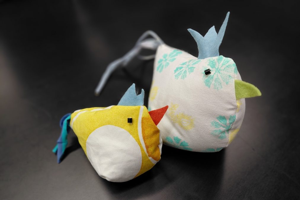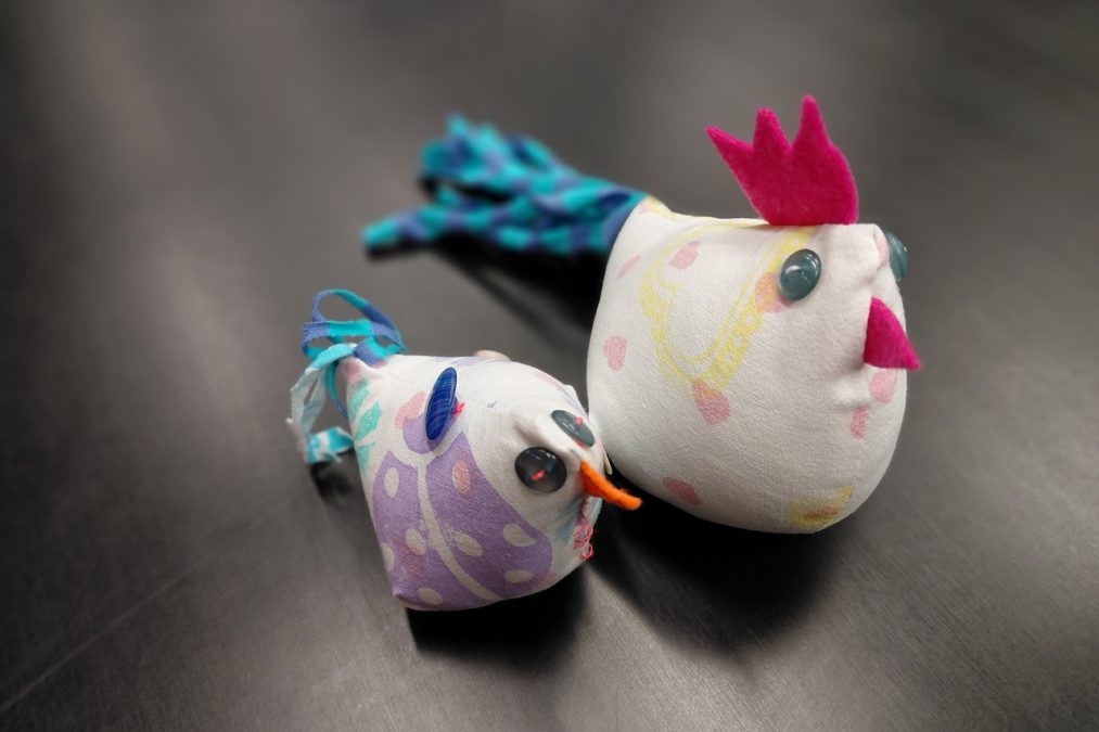 Pääsiäisen tuloon on mukavaa valmistautua vaikkapa ompelemalla pääsiäiskanoja! Pääsiäiskanoja lapsen kanssa -kursseilla painettiin kangasta erilaisilla leimasimilla, joka innosti monia kurssilaisia – aikuisia sekä lapsia. Painannan jälkeen kankaasta leikattiin kaavan mukaiset kappaleet isoon, pieneen ja/tai keskikokoiseen kanaan. Erivärisistä huovista leikattiin kanoille heltat ja nokat, ja trikootilkut suikaloitiin pyrstöiksi.