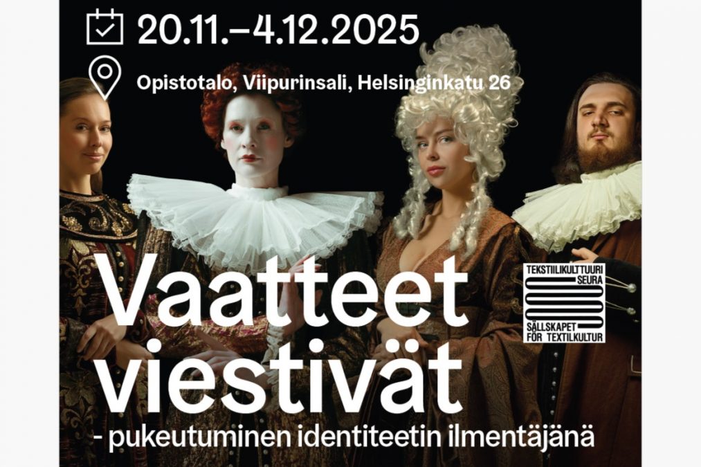Tekstiilikulttuuriseuran ja Helsingin työväenopiston yhteistyö luentosarjan järjestämisessä jatkuu. Tänä syksynä kuulemme asiantuntijoiden puheenvuoroja siitä, miten ja mitä viestimme vaatteillamme, tietoisesti tai tiedostamatta. Entisaikoina pukeutumisella ilmennettiin säätyä, varakkuutta ja yhteiskunnallista asemaa, tänä päivänä ehkä jotain muuta. Vaatteilla ja ulkoasulla välitetyt viestit eivät ole kadonneet mihinkään, vaikka aiheet ovat muuttuneet.