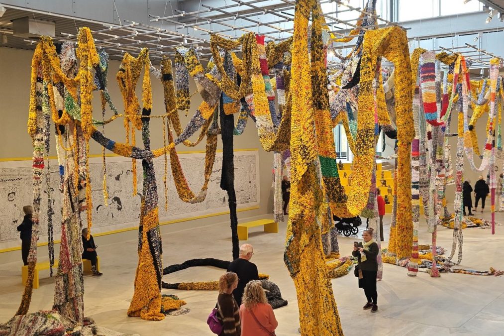 Neulominen on esillä ARKENin toisessakin näyttelyssä: Kenneth Rasmussenin installaatio on neulottu pääasiassa muovipusseista.