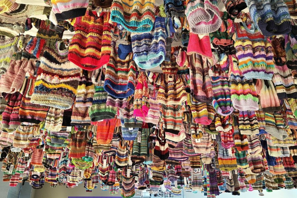 Näyttelyn puseroista tulee hyvä mieli. Vaikuttaa siltä, että neulominen on ollut kivaa ja innostavaa. Puseroissa on lappu, jossa kerrotaan tekijän nimi ja ikä, mutta puserot ovat harmillisesti niin korkealla, ettei lappuja pääse lukemaan. Osa puseroista on neulottu yhdessä esim. kouluissa.
